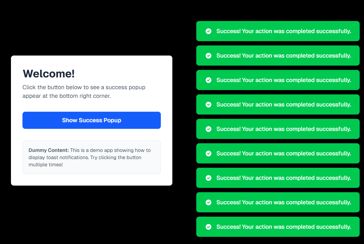You now have a fully custom toast notification system — starting from a single popup to a dynamic stacked version. This gives you: